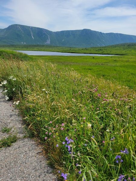 On July 8th, we got in line to board the ferry to Channel-Port aux Basques, Newfoundland. I didn't know how to make a booking (reservation) for our motorhome towing the truck, so I just made two separate bookings. It ended up being a little cheaper this way. The ferry ride was smooth, except it wasn't quiet trying to sleep in the lounge chairs. We were exhausted when we arrived, so we just drove a little up Hwy 1 and spent all day and night at the Newfoundland Wreckhouse Rest Area. This area is known to be the 2nd windiest place in the world! There used to be a narrow gauge train that ran through here. The winds frequently would blow the trains over. They don't have trains here anymore, lol. There is a reader board we saw on the way here, stating the wind speed. Thankfully it was only blowing about 2-20mph during our stay. Early the next morning, we moved on.