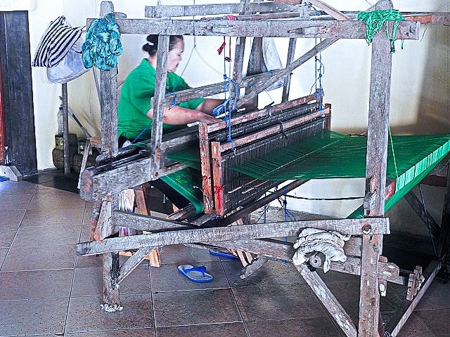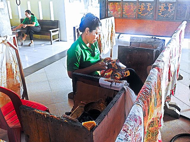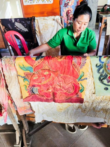 Our day of touring was in the area of the scenic village of Ubud. The drive through the village of Denpasar was interesting. Most buildings are very ornate and lots of scooters on the road. It was interesting to see what they carried on a little scooter. We saw them carrying goats, a family of 4, and a large kiosk/shop. Our first stop was at a shop where they made cloth using Batak, the traditional Indonesian textile art where patterns are created by applying hot wax to cloth, then dyeing it. The wax resists the dye, leaving behind intricate designs once the wax is removed.