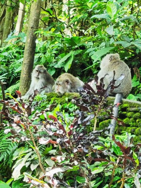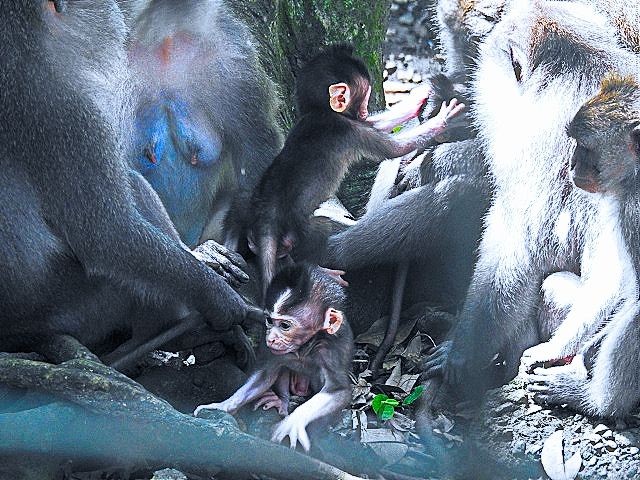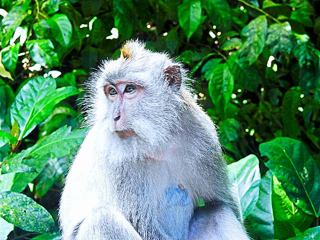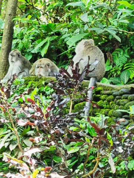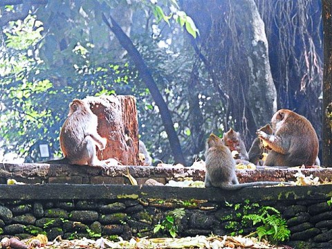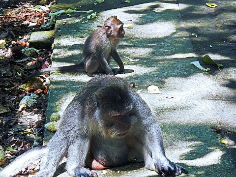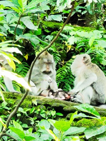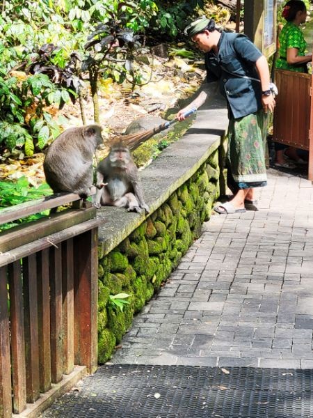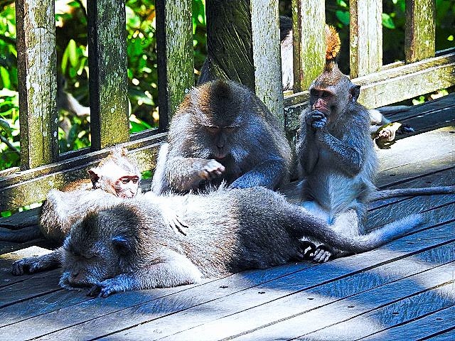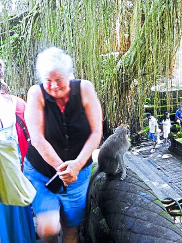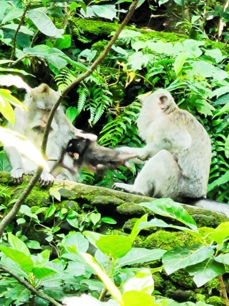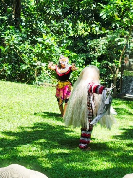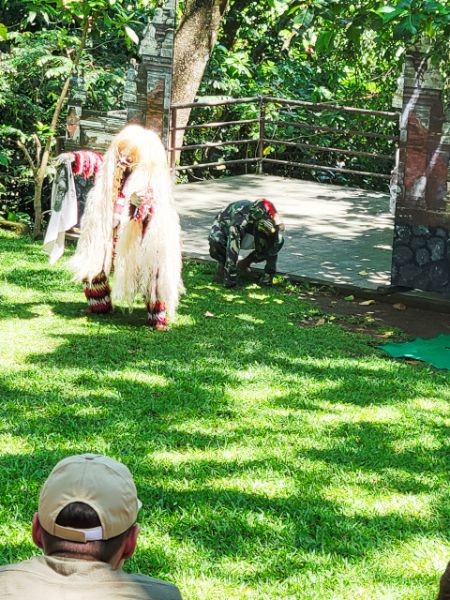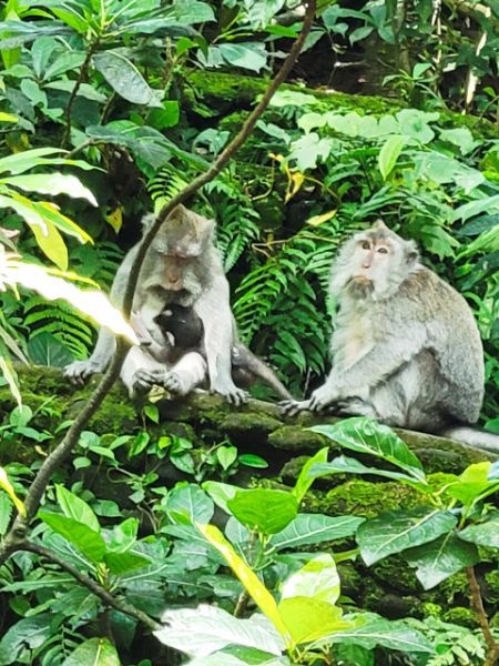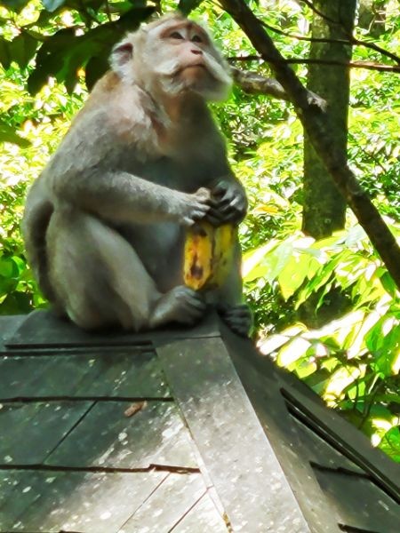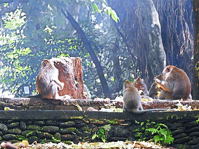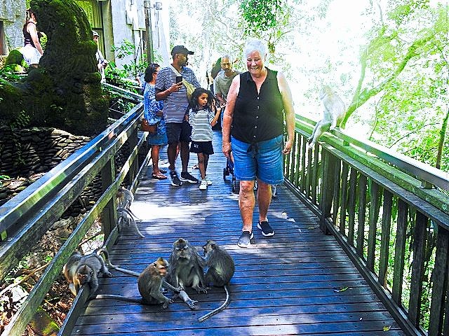 We asked our driver to take us to a nice place for lunch, where we wouldn't get "Bali Belly" (gastro problems). I don't recall the name, but it was perfect. Quiet, pretty, good food, and affordable. Then it was on to our next stop, the Ubud Monkey Forest. We had been warned about the monkeys in Bali. They've been known to steal glasses, hats, and phones from people. While this happened to several friends on the ship, we didn't have any problems. The theory is the monkeys are trained to "barter" for the stolen items. If you pay an attendant for food, the monkey will give you back your property in exchange for the food. We spent about 90 minutes walking around the jungle filled with over 1,000 Balinese Long‑Tailed Macaque. I greatly enjoyed seeing the monkeys with many babies. We also watched a short dance. We think it was called the Frog Dance, but we didn't watch the whole dance.