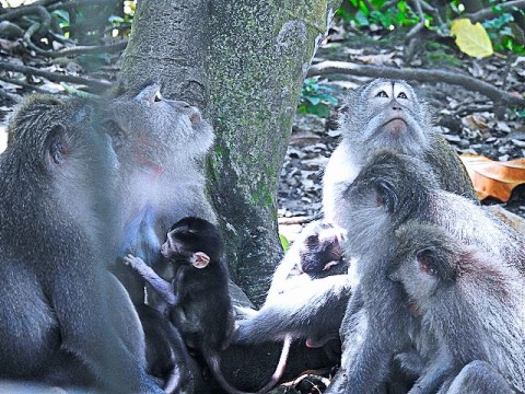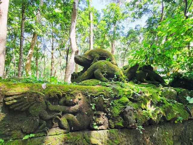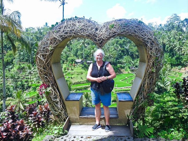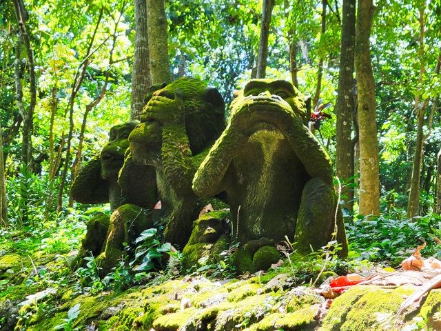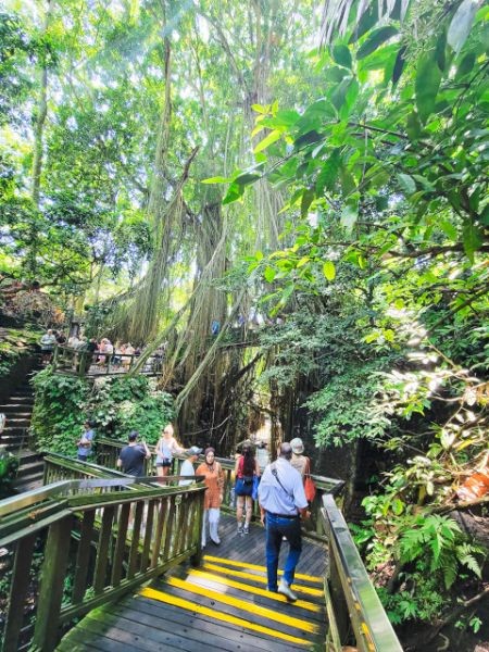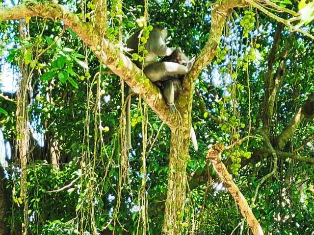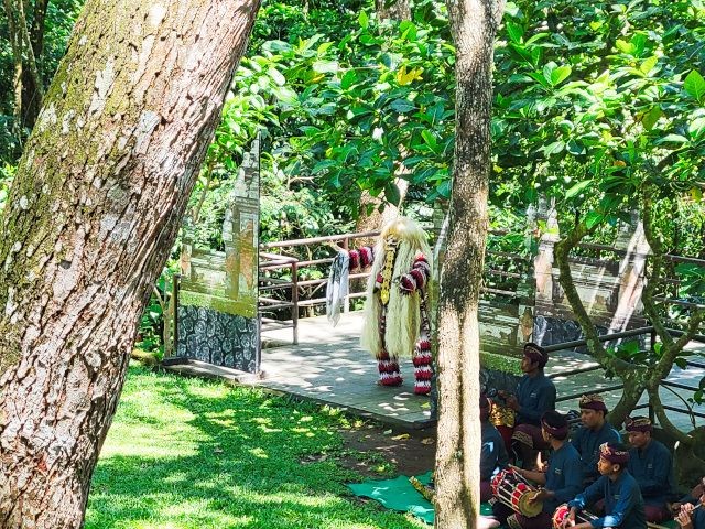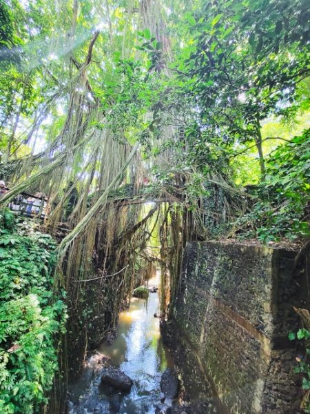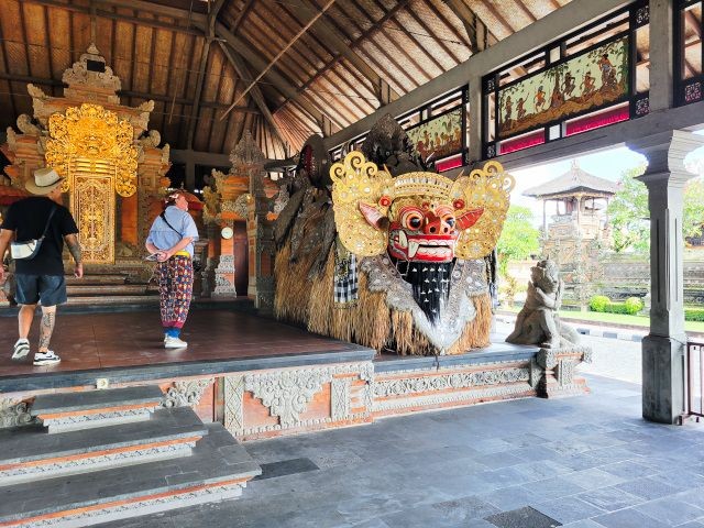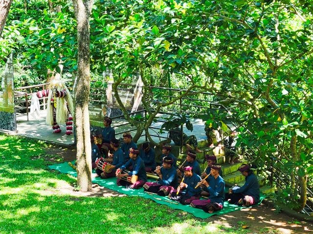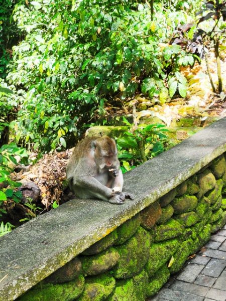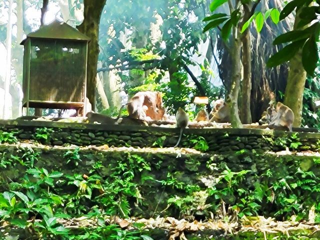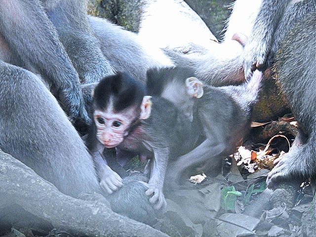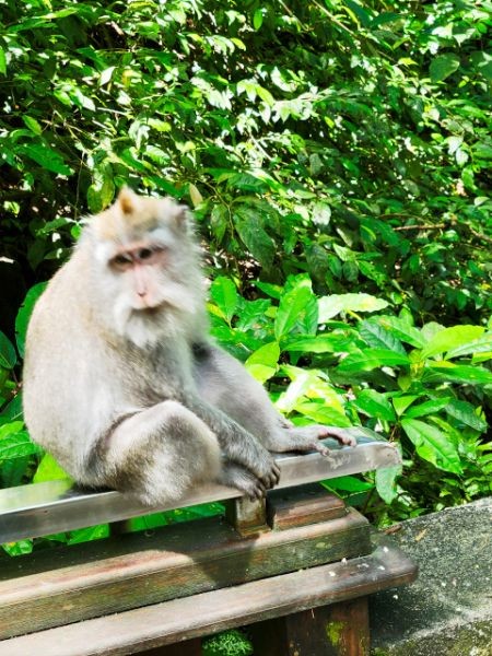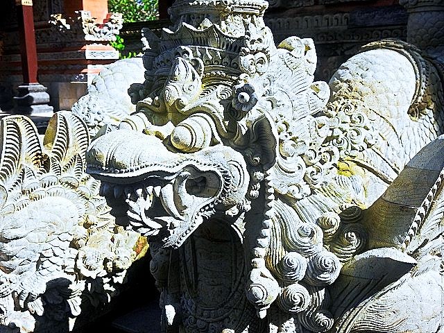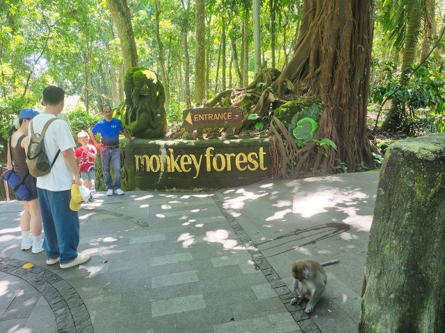 We asked our driver to take us to a nice place for lunch, where we wouldn't get "Bali Belly" (gastro problems). I don't recall the name, but it was perfect. Quiet, pretty, good food, and affordable. Then it was on to our next stop, the Ubud Monkey Forest. We had been warned about the monkeys in Bali. They've been known to steal glasses, hats, and phones from people. While this happened to several friends on the ship, we didn't have any problems. The theory is the monkeys are trained to "barter" for the stolen items. If you pay an attendant for food, the monkey will give you back your property in exchange for the food. We spent about 90 minutes walking around the jungle filled with over 1,000 Balinese Long‑Tailed Macaque. I greatly enjoyed seeing the monkeys with many babies. We also watched a short dance. We think it was called the Frog Dance, but we didn't watch the whole dance.