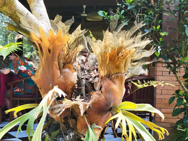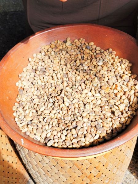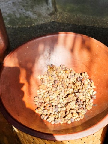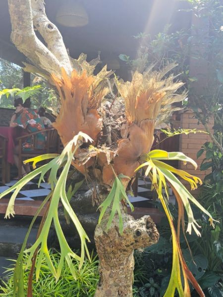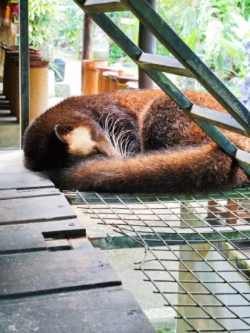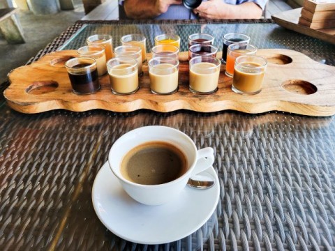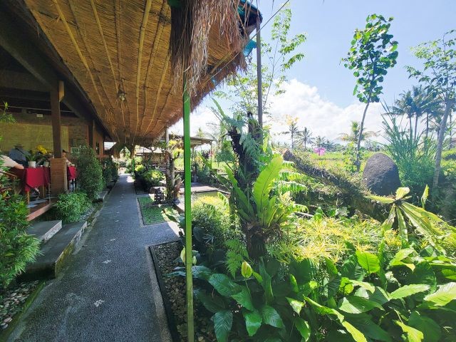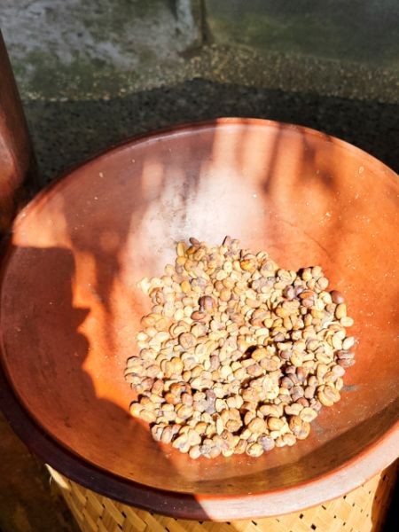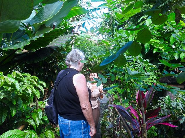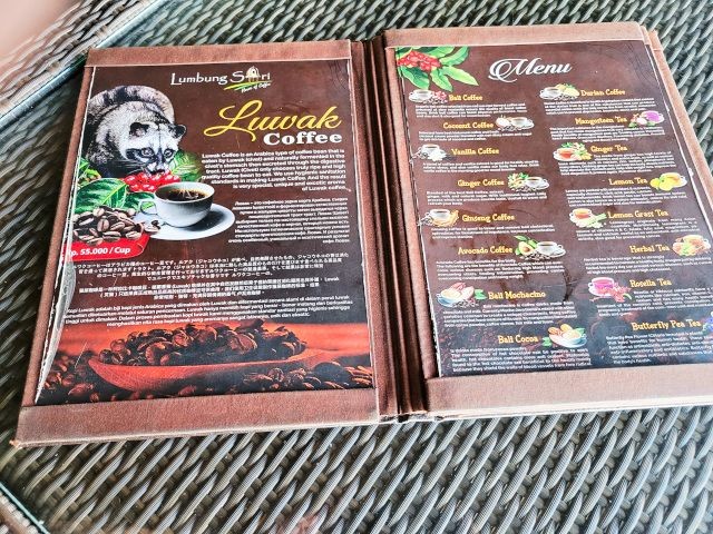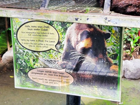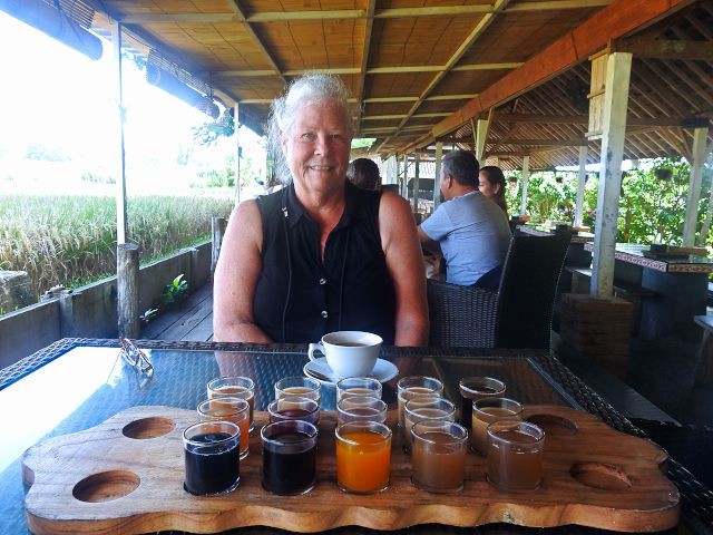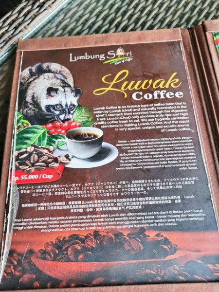 Next, it was onto Lumbung Sari House of Luwak Coffee, a well‑known coffee plantation and tasting spot just south of Ubud. They graciously welcomed us and gave us a short tour and explanation of the various plants used in making the variety of coffees and teas. We learned how Luwak Coffee was made. The luwak is known worldwide because of kopi luwak, the coffee made from beans that have passed through the civet's digestive system. The enzymes in the luwak's stomach alter the coffee beans, giving the coffee its distinctive flavor. It's in these feces that the beans are retrieved and made into coffee. Yes, coffee from animal crap. While I don't drink coffee, Connie does. We purchased Connie a large mug of Luwak coffee. We also got a large sampling of 15 types of coffees, teas, and cocoa. The tour and sampling were free, and it cost 55,000 IDR for her mug of Luwak coffee (less than $3 USD). All of the coffee samples, cocoa, and tea samples were pretty good. Connie enjoyed her Luwak coffee so much, we bought some in the gift shop.
