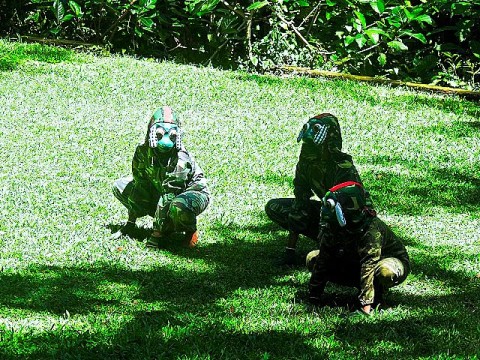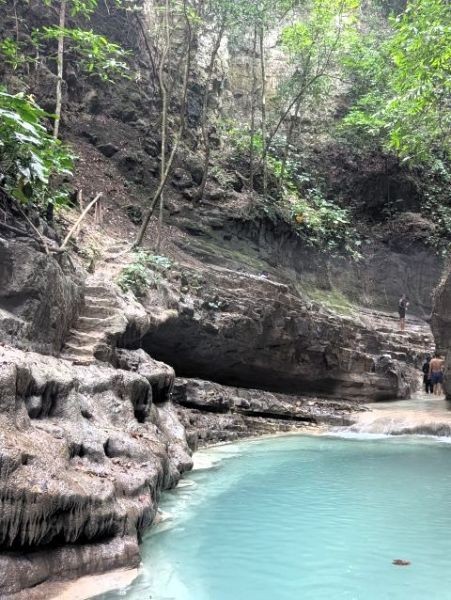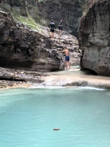 Eventually, the trail turned into dirt/mud with tree roots used as the steps. The trail was pretty steep now, with a rickety bamboo railing to help provide support. I was really doubting myself and worried about making the long, steep climb back out. But we'd come this far, I might as well finish what I started. We finally got to the end of the trail. We arrived at a small pool and creek with the waterfall around the corner. We couldn't see it, as you needed to go across the creek and up steps carved into the rocks to get to the last part of the trail to see the falls. I took off my shoes and socks and started to wade across the creek. It was extremely slippery and I was already very tired from the hike down. We rested for a while and tried again. Within 2 steps, I slipped on the rocks. They were EXTREMELY slippery. At this point, I realized we weren't at the falls I expected. This was no "Grand Canyon of Sumba Island". This was going to be a small waterfall of about 10' high.