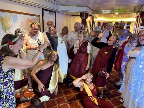 On our sailing to Melbourne, the entire ship turned into one huge toga party! A couple residents plan and host a Murder Mystery onboard about every six months. This time, the theme was A Greek Odyssey Murder Mystery. Most of the ship got with the program and enjoyed a night of games and fun. Our team even won!